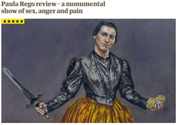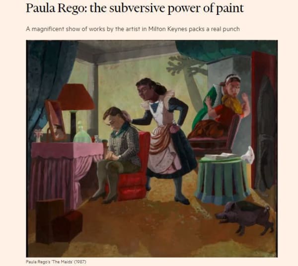 Major solo exhibitions of Rego's work have recently taken place at The National Gallery, London (2023); Pera Museum, Istanbul; Kestnergesellschaft, Hannover; Arnolfini, Bristol (2022); Tate Britain, London, travelling to Kunstmuseum den Haag, Netherlands, Museo Picasso Málaga, Spain (2021-22); the Irish Museum of Modern Art, Dublin, which toured from the Scottish National Gallery of Modern Art, Edinburgh and MK Gallery, Milton Keynes (2019-2020); Musée de L'Orangerie, Paris (2018); La Virreina Centro de la Imagen, Barcelona (2018); Jerwood Gallery, Hastings (2017); Pallant House, Chichester (2017).