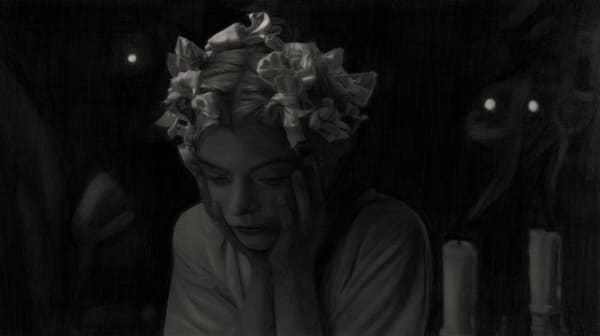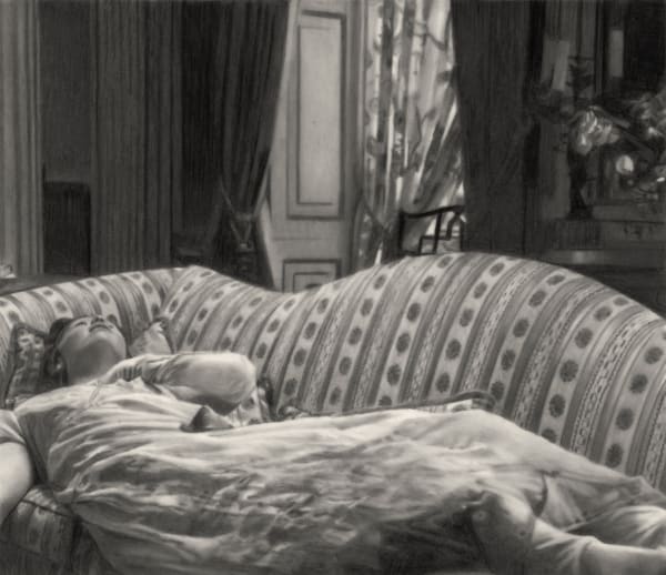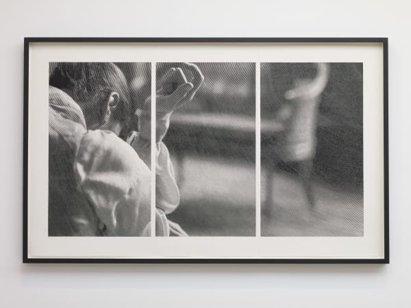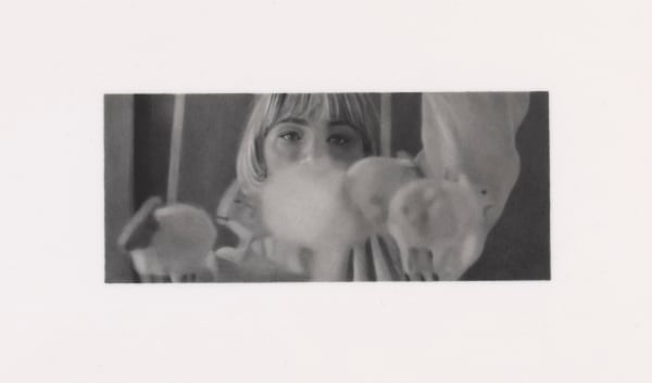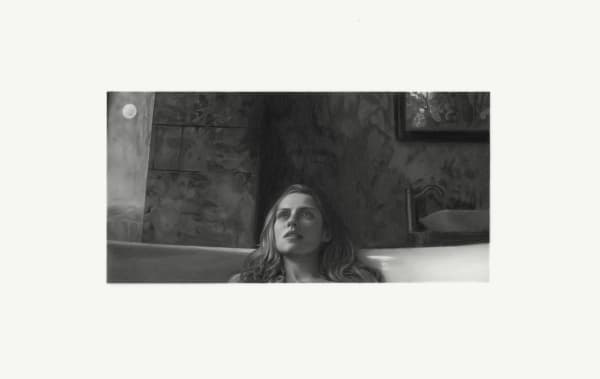 Harnett makes highly detailed, meticulous drawings derived from film stills which capture fleeting moments of drama, beauty and suspense. By removing the stills from their context and reworking them as intricate pencil studies, Harnett focuses on every aspect of pose, light and texture. Harnett also explores these themes in her printmaking, which include large scale linocut prints of images built up from black and white curving lines, which can take up to one month to carve, and a series of mezzotints, which are housed in the permanent collection of the British Museum, London.