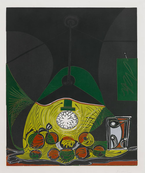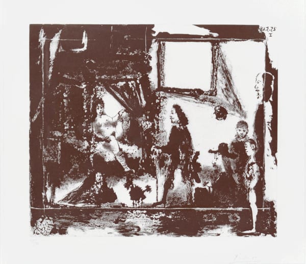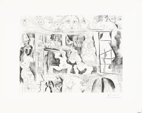Having moved to the South of France in the late 1950s, Picasso was physically distanced from his intaglio and lithography collaborators in Paris and therefore turned his hand to linocuts. Picasso cut, printed and cleaned just one piece of lino over and over again to gradually build up an image and create the final artwork. His printmaking activities became ever more intense throughout his life, culminating in a huge body of etchings and aquatints. These include 347 engravings completed in just seven months between 16 March and 5 October 1968 with master printmaker Aldo Crommelynck. The 347 series toured internationally in 1968 with exhibitions at Galerie Louise Leiris, Paris; Art Institute of Chicago; and Museum of Modern Art, New York.