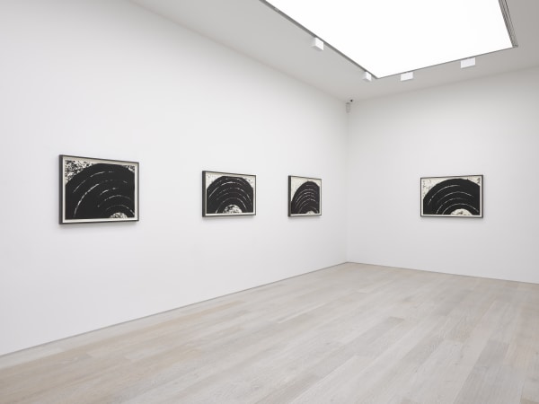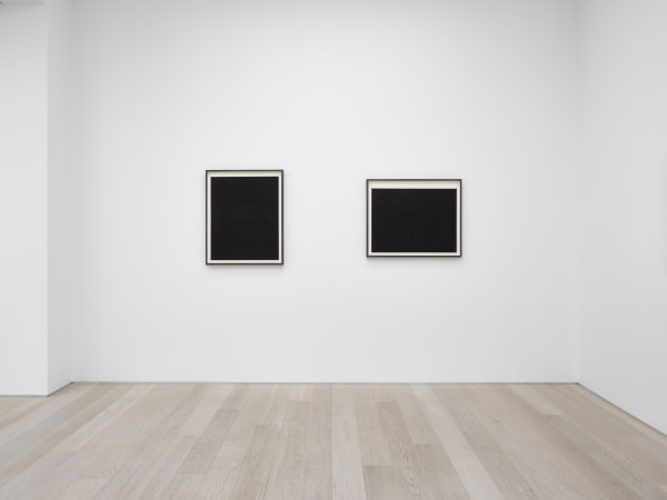 New works, such as Horizontal Reversals, 2017, are defined by the juxtaposition of two pieces of handmade paper framed together, that have each been divided by densely layered black pigment. This reversed composition offers a striking contrast between the weight of the black sections and the purity of the untouched white paper, as he explores the physical balance between light and dark.