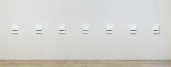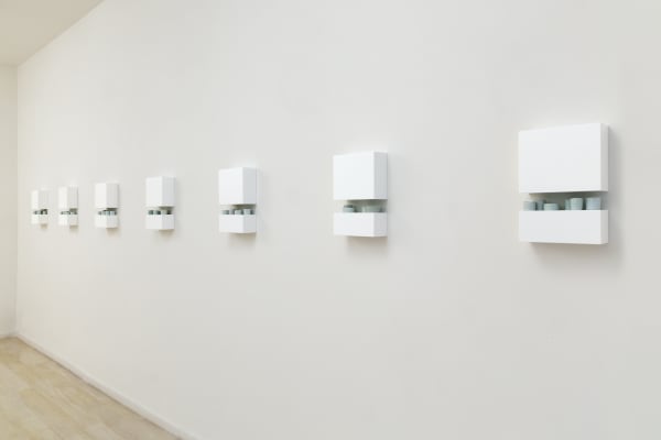Each work consists of several small porcelain vessels inserted between two white wooden boxes.