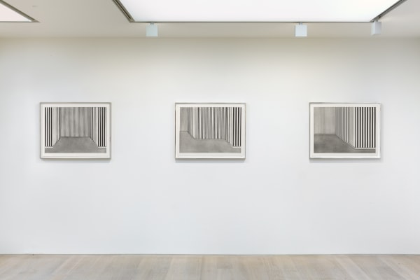Paul Noble's (b. 1963) second print project with the gallery, entitled Rooms with Wallpaper, relates directly to twelve drawings he has been making over the past eighteen months. These meticulous etchings with aquatint are depictions of what the artist describes as ‘sublime prisons’, which show the possibility of freedom within containment. The images portray a section of a seemingly endless room with no doors or windows; no escape, which offer us a different relationship to space and being in space. They play with the idea of foreground and background while somehow resisting being perspectival. They almost verge on the abstract with their repetition of vertical lines of graduating tonality.