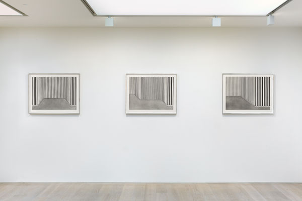 Paul Noble's (b. 1963) second print project with the gallery, entitled Rooms with Wallpaper, relates directly to twelve drawings he has been making over the past eighteen months. These meticulous etchings with aquatint are depictions of what the artist describes as ‘sublime prisons’, which show the possibility of freedom within containment. The images portray a section of a seemingly endless room with no doors or windows; no escape, which offer us a different relationship to space and being in space. They play with the idea of foreground and background while somehow resisting being perspectival. They almost verge on the abstract with their repetition of vertical lines of graduating tonality.