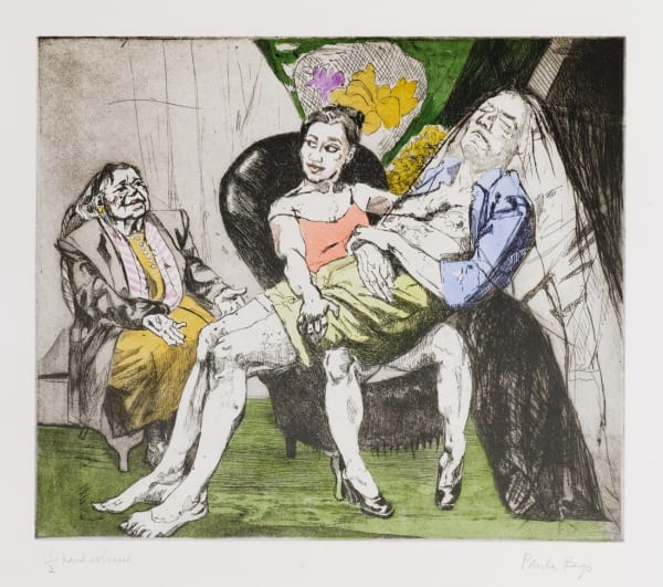 Over the course of her career, Rego has produced a profound and ground-breaking body of prints. The work not only possesses the extraordinary imaginative power of her paintings, but reflects the innovative possibilities of the medium through her experimentation with etching, lithography and aquatint, often employing hand colouring in the process. Paula Rego comments, “I always had a press in my studio – even in Portugal in the early days – my father bought me a giant lithography press but the stones were too heavy for me to use on my own so I got myself some copper plates and used it as an etching press and in my late teens and early twenties I would wax them myself and use the acid and so on and when I’d get stuck or didn’t know what to do I’d make a print. The process, doing all the stuff, would free up my mind and let me just work without the pressure of making art. Often that’s when you do your best things. I start with a story by Hogarth or Charlotte Brontë and then my own story takes over – sometimes without me intending it to. I discover things about myself that way. What I really feel and so on.”
