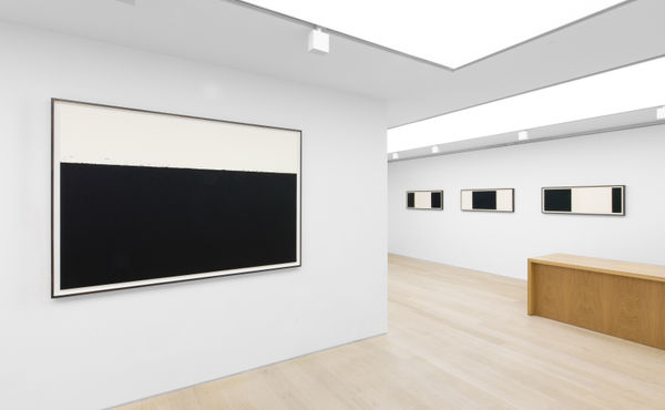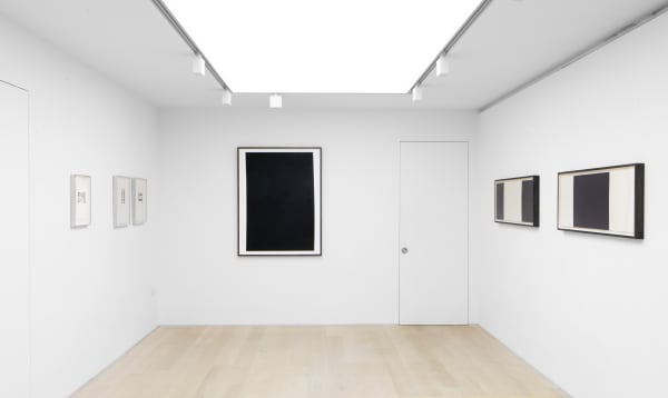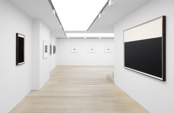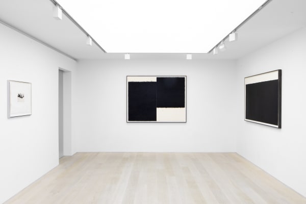 Richard Serra has been making prints that convey the weight, stability, and density of his sculptures for almost 50 years. His new work, Backstop II, 2021, is made using a combination of etching and Paintstik. Two pieces of handmade paper that have each been divided by densely layered black pigment, are framed together. This reversed composition offers a striking contrast between the weight of the black sections and the purity of the untouched white paper, as Serra considers the physical balance between light and dark.