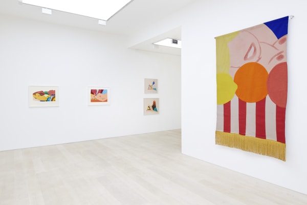 The early works in the exhibition demonstrate the beginning of Wesselmann’s experimentation with various techniques; a large fabric banner; embossed prints which leave only the shape of the object visible; and his use of collage in Bedroom Collage Edition, 1974, featuring the landscape of a New York postcard, next to a breast and an orange. Having started out depicting the entire nude female form, Wesselmann later shifted to disembodied, individual body parts such as the mouth, feet, and breasts, as seen in his series of five hand-painted prints, entitled Bedroom Portfolio, 1978.