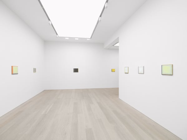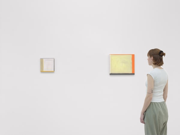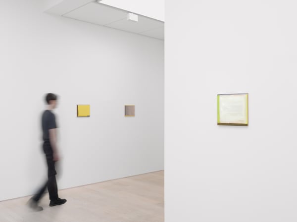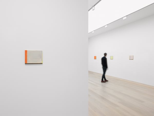 Central for Parsons is that the paintings convey a much larger sense of scale and space than their small size might initially suggest. In some works, space is shaped and defined by lines and structures that recall architectural elements, while in others Parsons uses paint to veil or shadow interiors that can be glimpsed beneath. More recent paintings encourage space to expand and grow and creep towards the borders of the panel. As the limits of space are stretched, pulsating colour or soft yet luminous horizons reminiscent of the landscape are revealed, and the texture of paint and the mark of the brush become core elements of the visual field. In one of the most recent paintings in the exhibition, a white light pushes towards the foreground and almost dissolves its marked boundary.