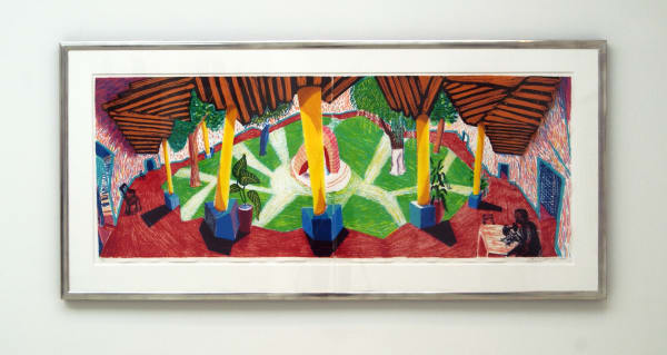 Hockney made the two Hotel Acatlán prints featured in this exhibition after discovering the hotel when car trouble forced him to stop in the midst of a journey to Mexico City. Hotel Acatlán: Second Day is based on sketches made of the hotel courtyard shortly after his arrival. Further sketches made when he revisited the hotel on the return leg of his journey resulted in Hotel Acatlán: Two Weeks Later. The figure in the lower right corner of this print refers to his 1954 portrait of his mother, Woman with a Sewing Machine.