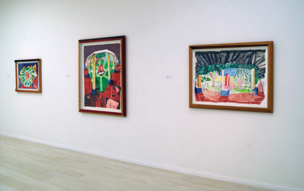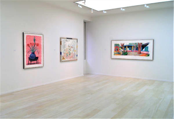 The Hotel Acatlán also provided the subject matter for the three View of Hotel Well lithographs hanging in the exhibition, each one providing a different viewpoint of the central feature of the courtyard. The sense of distorted perspective is here enhanced by the skewed, hand-painted frames designed by Hockney himself.
