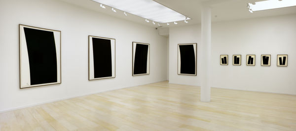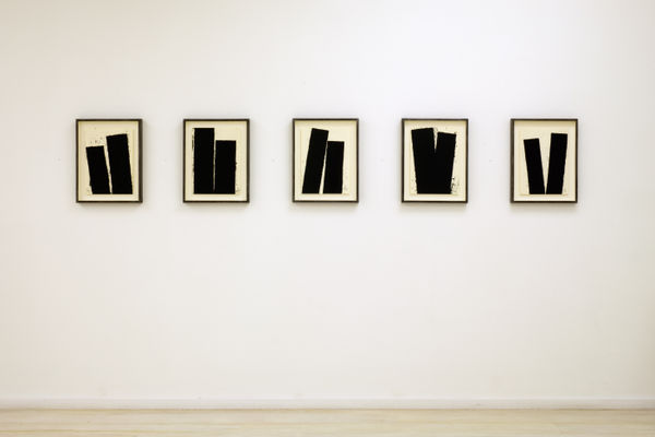 This exhibition focuses on three groups of etchings from the past ten years. Extension and Trajectory are both part of the Arc of the Curve series from 2004, and examine movement through space and the curve of a line, from broad, sweeping gestures to slight bends and turns. Some lean dramatically; others stoop. In contrast, Ballast (2011), is a series dealing with weight, stability and control; the black mass sits at the bottom of the sheet, revealing a small glimpse of white paper at the top. These prints are serious, minimal and sculptural - a closer look at their surface reveals a highly pitted, three-dimensional, intaglio landscape.