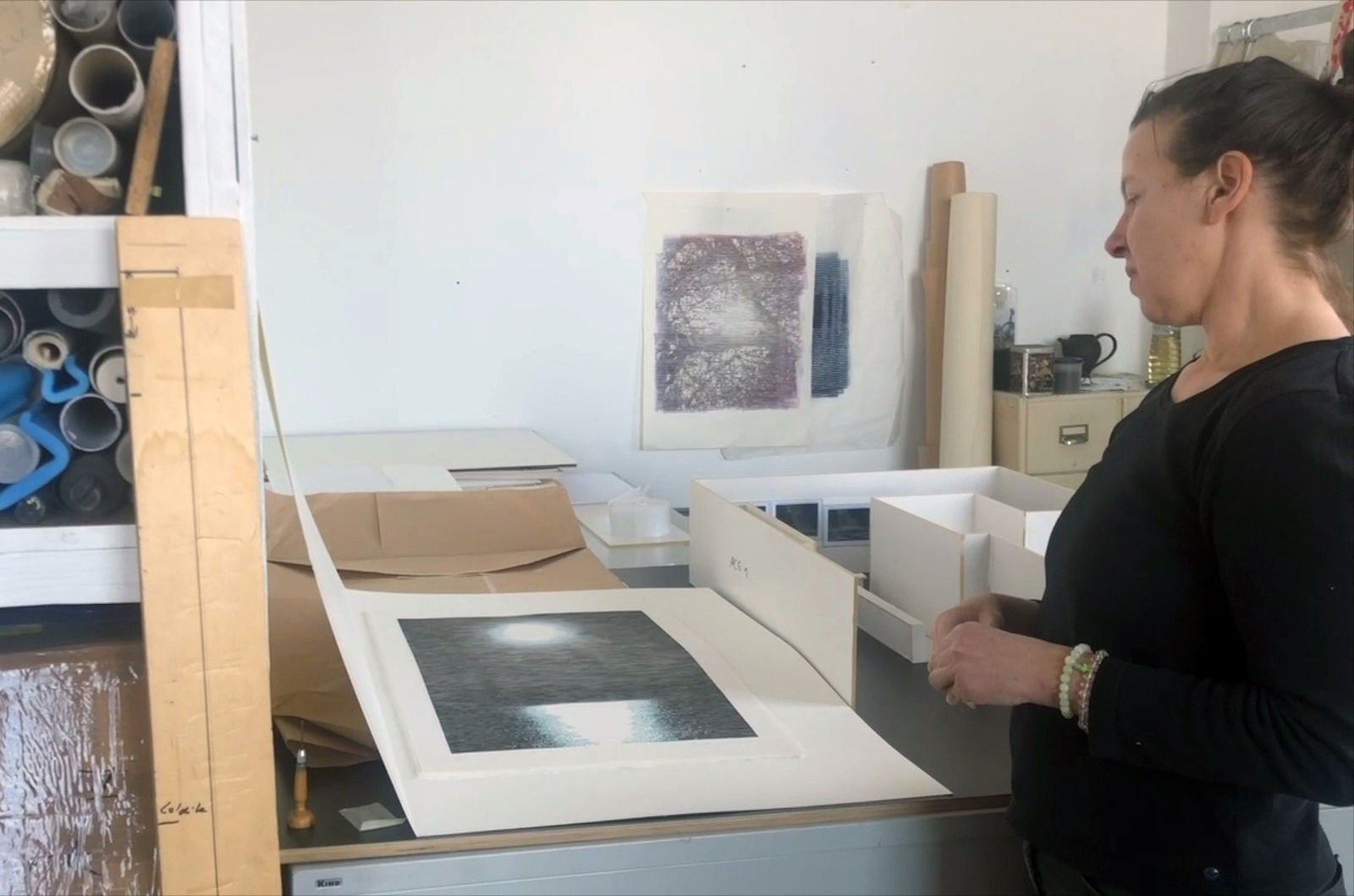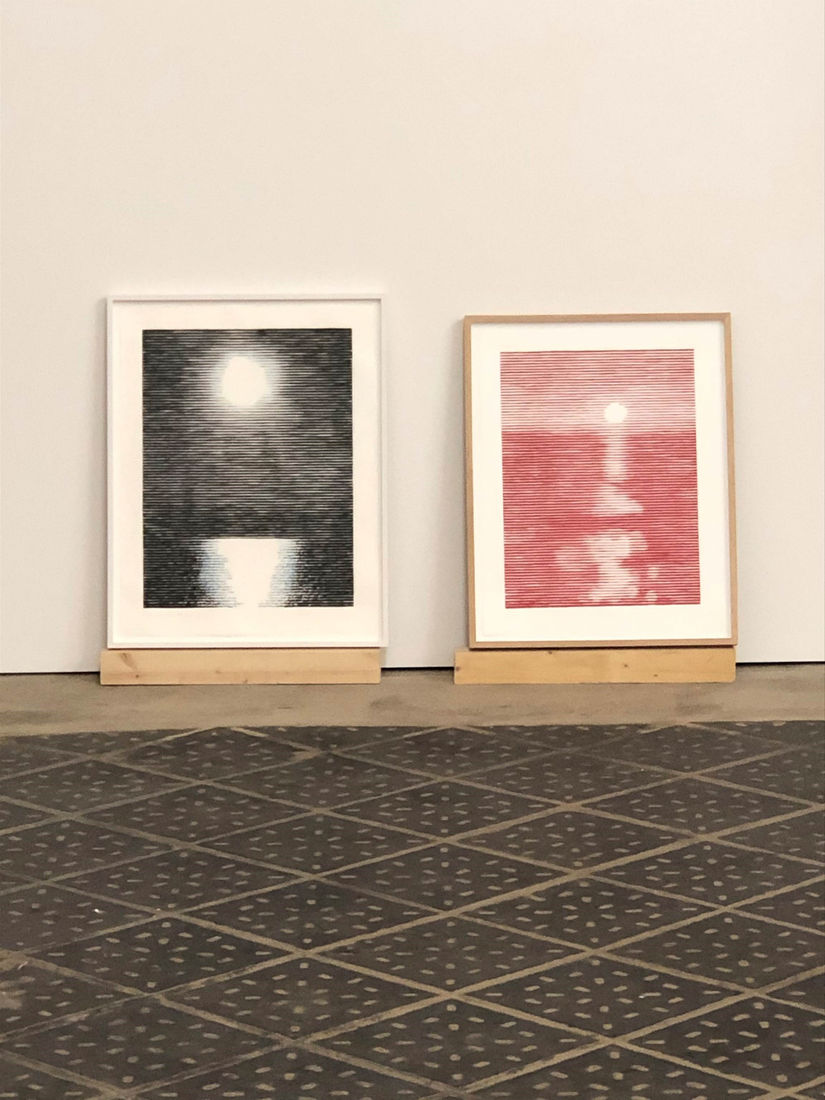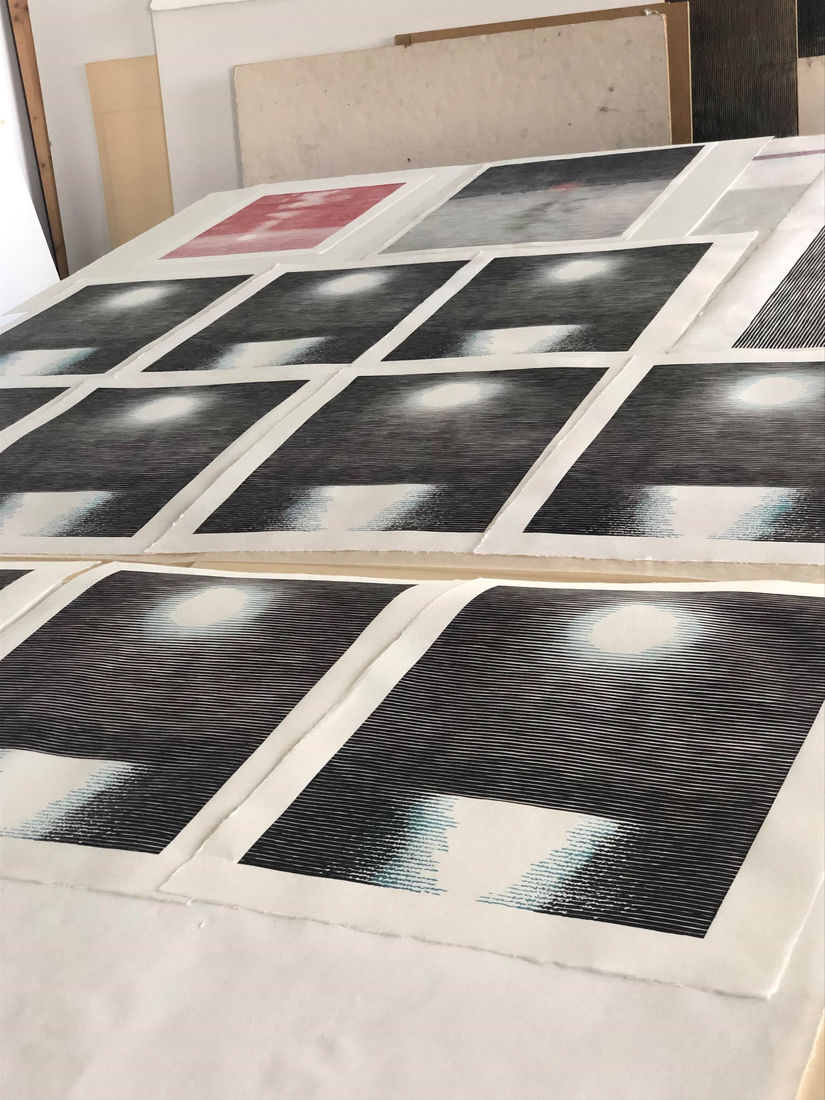 Born in Leipzig in 1967, the artist is best known for the monumental woodcuts she makes based on her own films, photographs and video stills. Due to the recent lockdown in Germany she has been unable to access the large sheets of wood she needs to make her vast prints but, undeterred, has continued to work with her own supply of smaller plates. Baumgartner has always been concerned with the evocation of movement and the play of light and this new woodcut conjures up the dazzling effect of a sunrise in the Middle East.