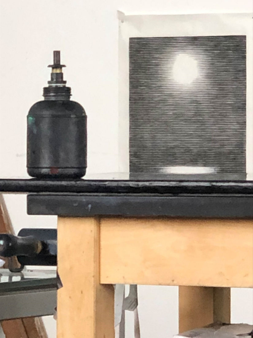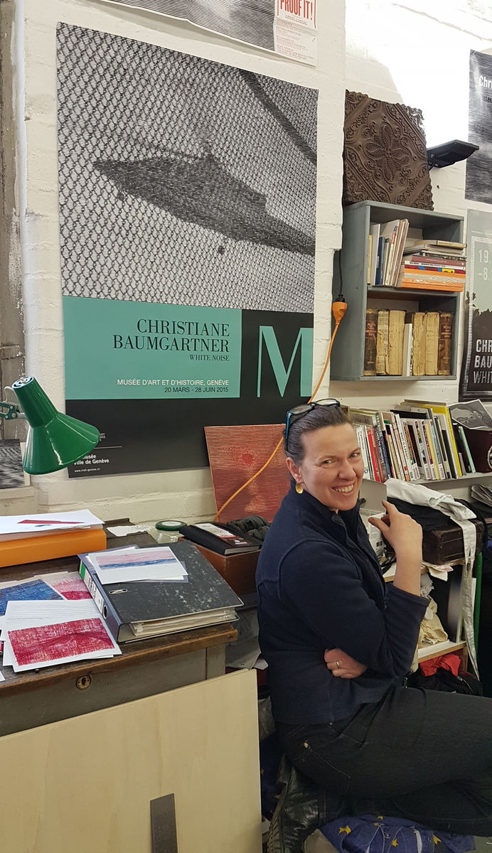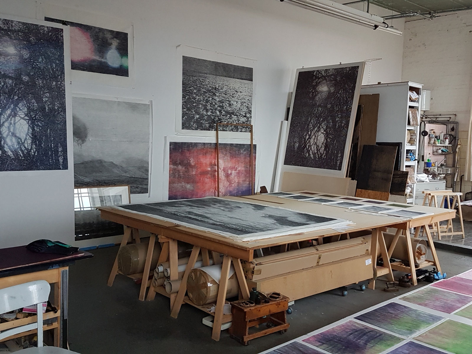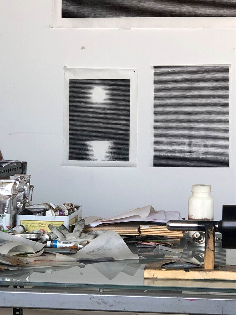 Born in Leipzig in 1967, the artist is best known for the monumental woodcuts she makes based on her own films, photographs and video stills. Due to the recent lockdown in Germany she has been unable to access the large sheets of wood she needs to make her vast prints but, undeterred, has continued to work with her own supply of smaller plates. Baumgartner has always been concerned with the evocation of movement and the play of light and this new woodcut conjures up the dazzling effect of a sunrise in the Middle East.