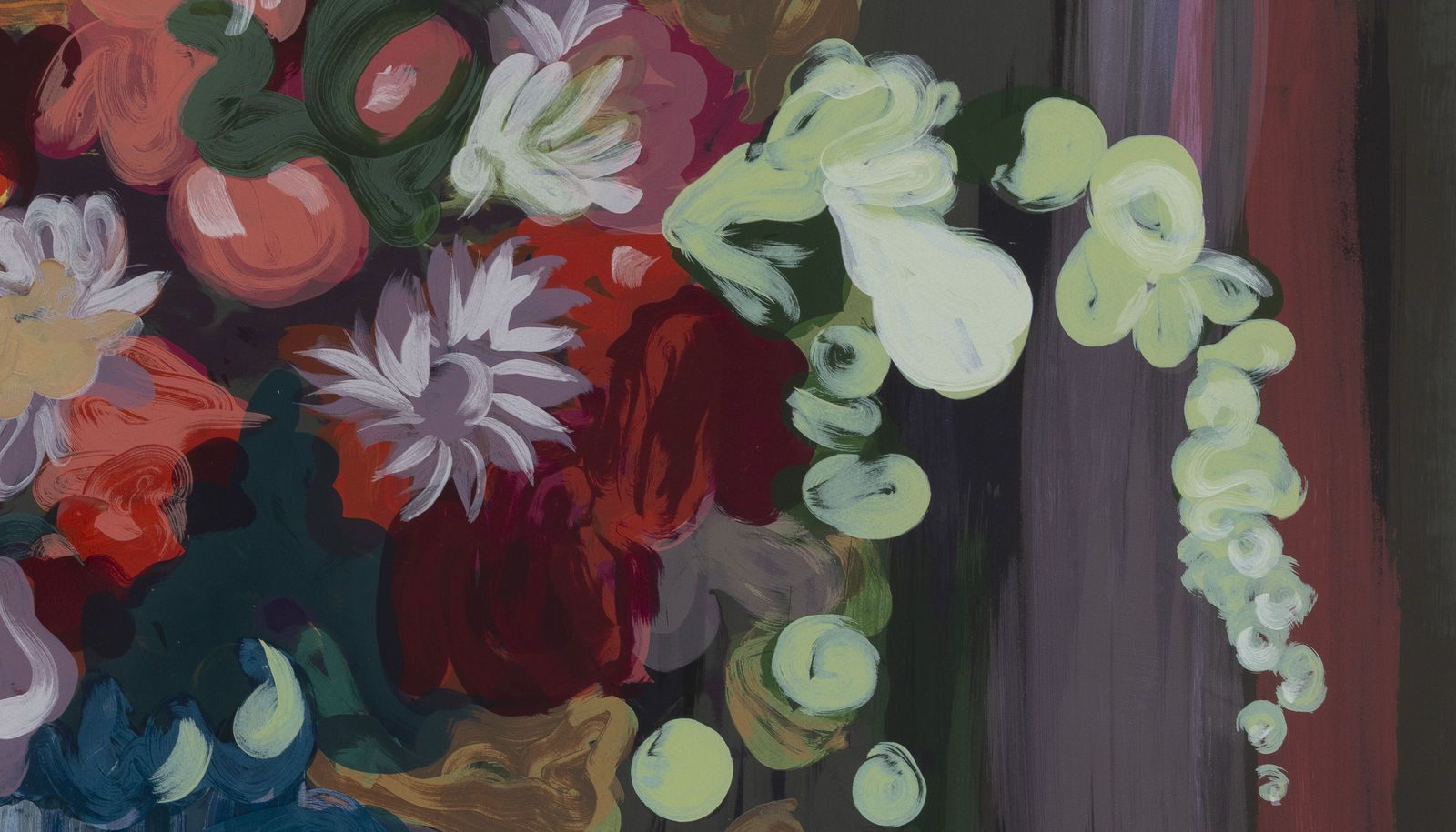 Woods’ approach to printmaking is striking for its painterly effect, as the artist jostles between legibility and representation, simultaneously deconstructing and reconstructing her subject. Through her expressive style, Woods emphasises the formal elements of the composition, drawing the viewer’s attention to colour, line, and shape. Throughout her oeuvre, Woods disrupts the historical genre of still life by obscuring, cropping, and repositioning her subject’s form, reminding the viewer that not everything is as it seems.